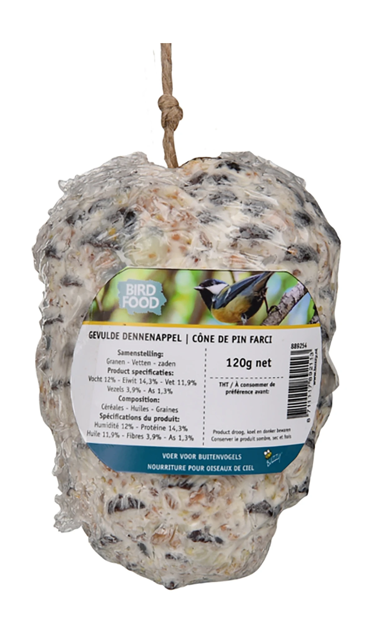 Einfach aufzuhängen dank der praktischen Aufhänge Schnur. Reich gefüllter Tannenzapfen mit Fett und Samen. Kann das ganze Jahr über gefüttert werden.