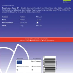 Beliebte fadenlose Feuerbohne mit leuchtend roten Blüten – dekorativ für Rankgitter und Spaliere, Sehr kräftiger Wuchs, robust und unanfällig gegen Wind. Wohlschmeckend. Direktsaat nur in erwärmten Böden. Samenfest.