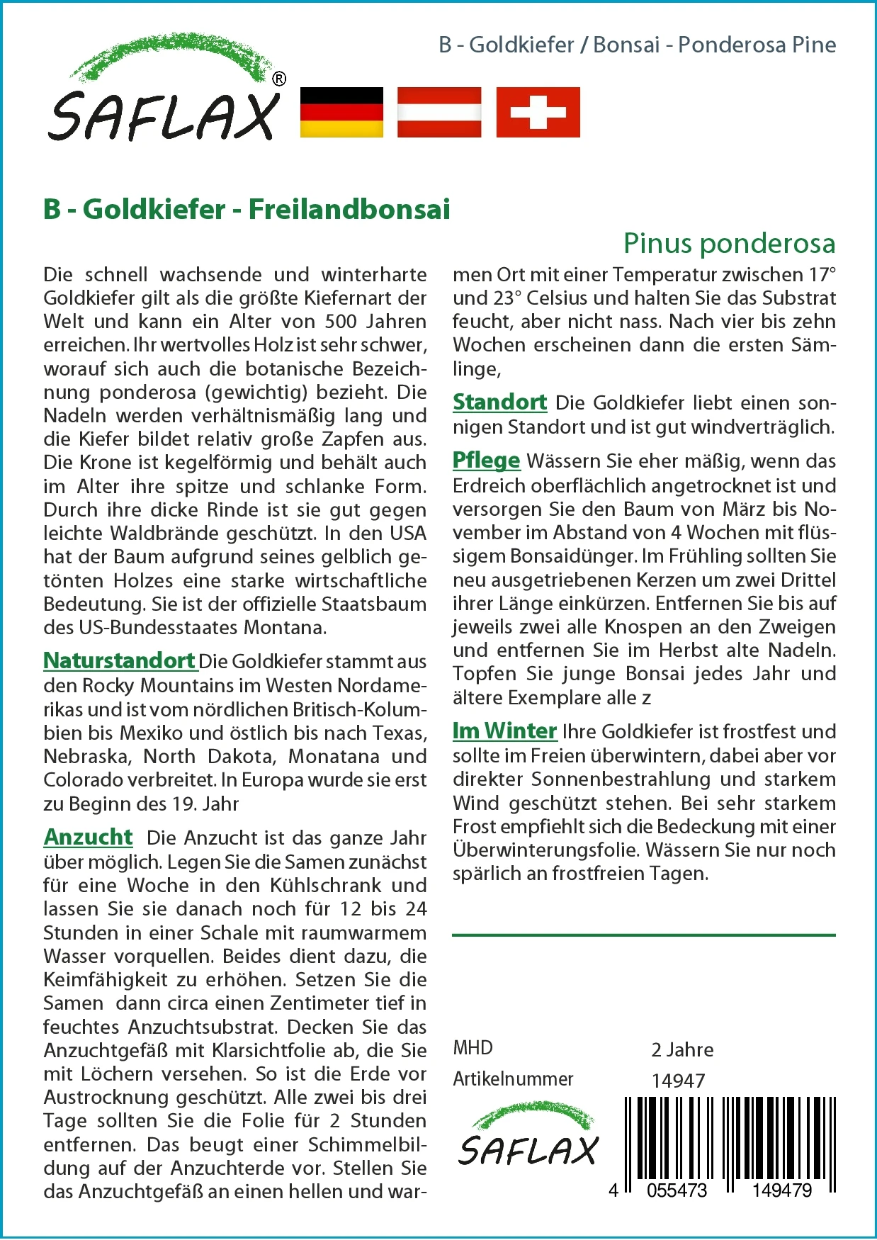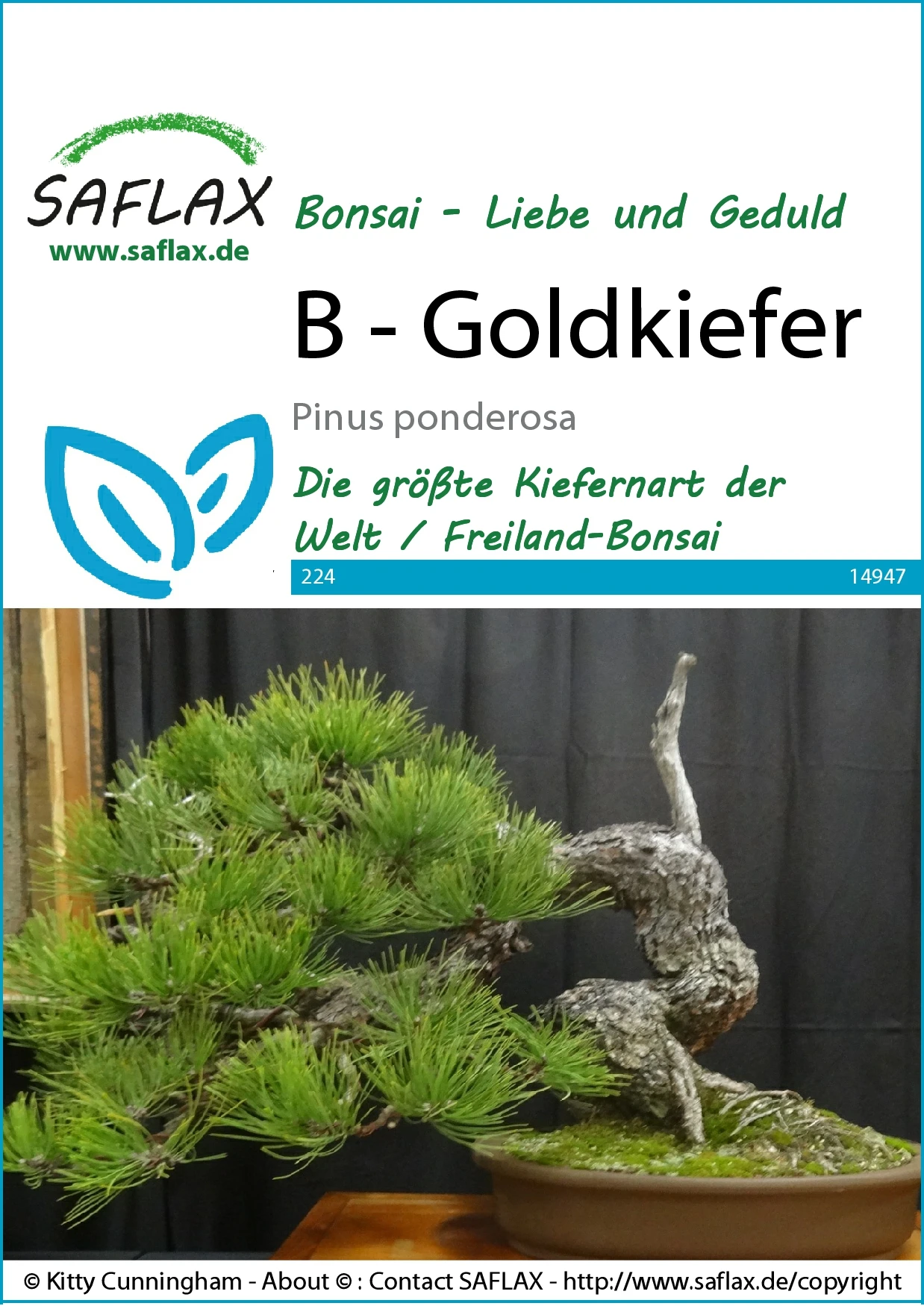 Die schnell wachsende und winterharte Goldkiefer gilt als die größte Kiefernart der Welt und kann ein Alter von 500 Jahren erreichen. Ihr wertvolles Holz ist sehr schwer, worauf sich auch die botanische Bezeichnung ponderosa (gewichtig) bezieht. Die Nadeln werden verhältnismäßig lang und die Kiefer bildet relativ große Zapfen aus. Die Krone ist kegelförmig und behält auch im Alter ihre spitze und schlanke Form. Durch ihre dicke Rinde ist sie gut gegen leichte Waldbrände geschützt. In den USA hat der Baum aufgrund seines gelblich getönten Holzes eine starke wirtschaftliche Bedeutung. Sie ist der offizielle Staatsbaum des US-Bundesstaates Montana.