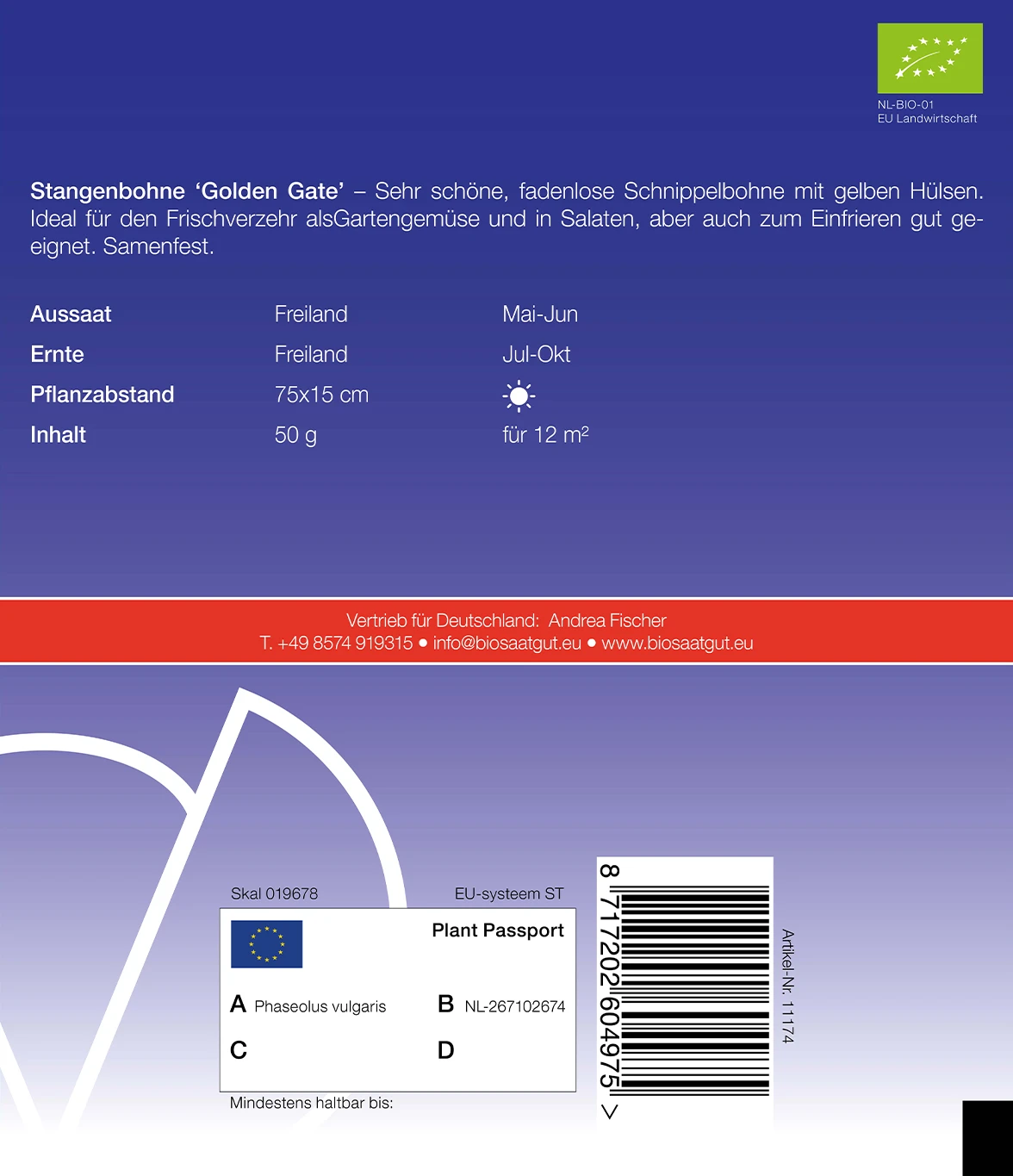 Sehr schöne, fadenlose Schnippelbohne mit gelben Hälsen. Ideal für den Frischeverzehr als Gartengemüse und in Salaten, aber auch zum Einfrieren gut geeignet. Samenfest.