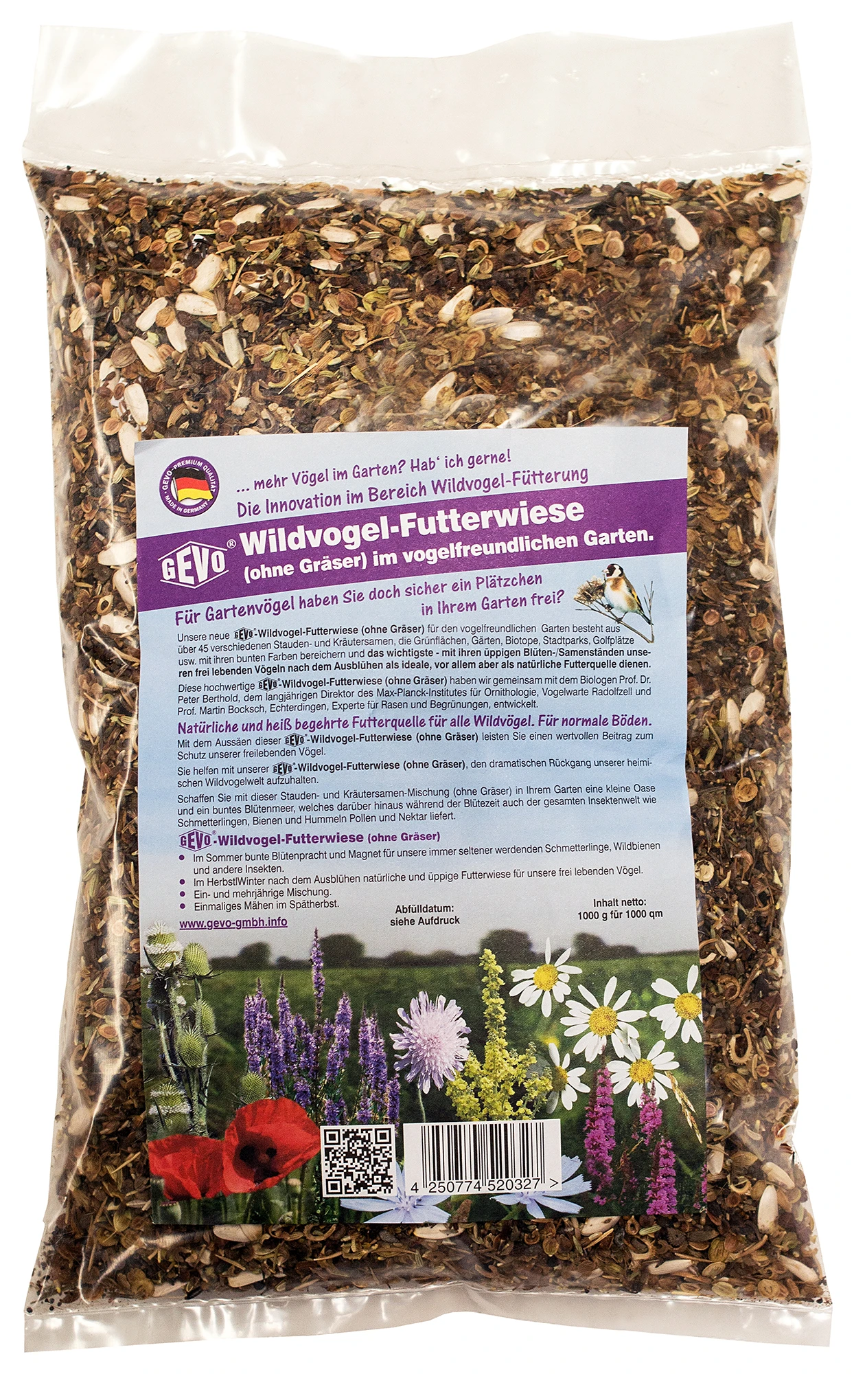 Die GEVO-Wildvogel-Futterwiese (mehrjährig – ohne Gräser) ist die natürliche Ergänzung der Ganzjahresfütterung. Ideal für alle Naturfreunde, die sich der Artenvielfalt und unseren heimischen Singvögeln verschrieben haben. Sie ist in Gebinden für 5 und 200 qm mit Saathelfer sowie für 1.000 qm für professionelle Anwender erhältlich. Mit über 45 verschiedenen Stauden- und Kräutersamen. Zahllose bunte Blüten bereichern jeden Garten!
